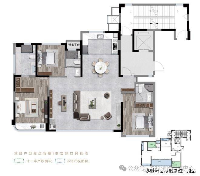 建筑面积约128㎡样板间示意图,仅作为装修创意展示,非交付标准,本项目为毛坯交付。如业主需进行结构优化的,需交付后自行向政府部门进行装修备案,存在无法审核通过的风险,开发商在此不做承诺;如通过装修备案的,后续结构优化施工费用由业主自理。