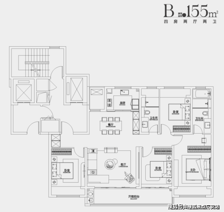 155㎡四房两厅两卫:一梯一户设计,私密性高,独立外玄关入户。南向四开间,三卧朝南,南向双联阳台。主卧也是套房设计,带衣帽间和内卫,且带有浴缸