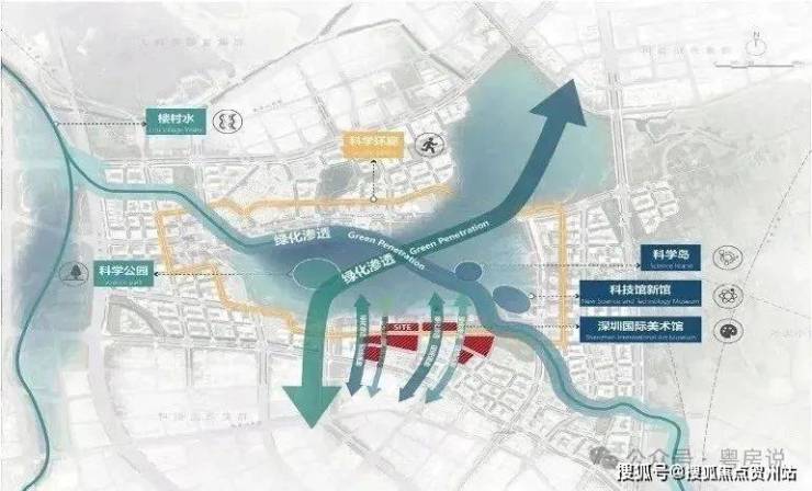 以科学公园为轴心,深圳国际美术馆及深圳科学馆(新馆)为主角,结合本案核心节点,形成超宽城市视廊,如开启城市的大门,将绿脉引入街区。