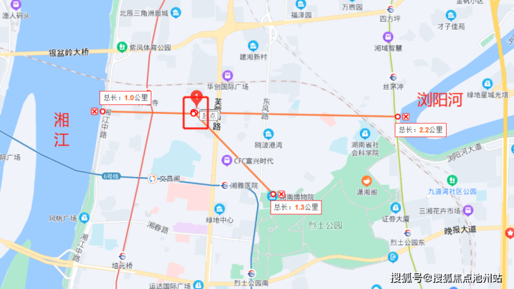 芙蓉路、湘江路、三一大道、五一大道等城市主干道通达全程;双地铁一城轨如下图: