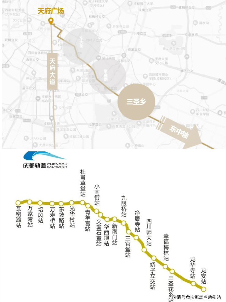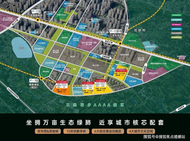 六条城市主干道构成"三横三纵"路网,快速连接金融城、东大街等核心商圈;三大TOD枢纽(三圣乡/林家坝/川师)环伺,汇聚2/7/9/13/20号线五条地铁;双机场通达优势:20公里直达双流机场,50公里接驳天府国际机场。