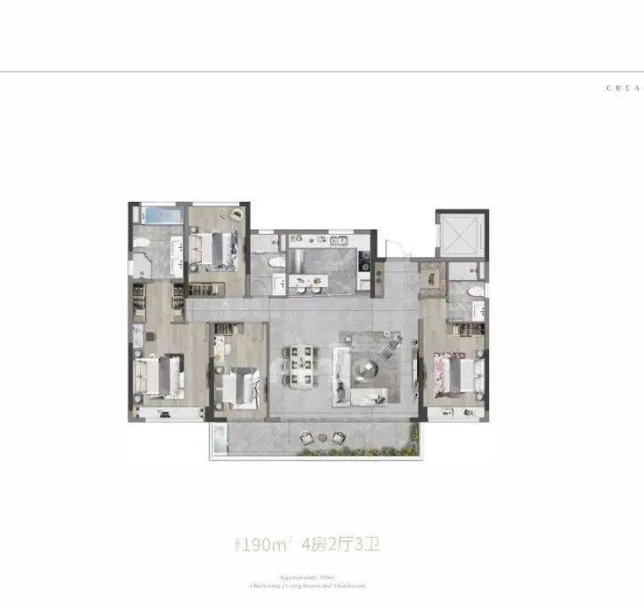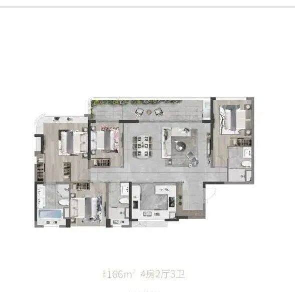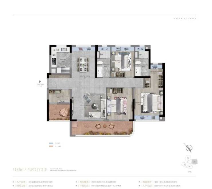 飞机式布局、四开间朝南的竖厅四房,可以一站满足二孩家庭的居住需求。