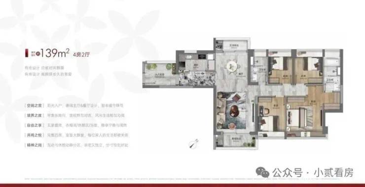 建面139平四房两卫,独立入户花园,大客厅,南北对流双阳台设计,主卧套房带衣帽间