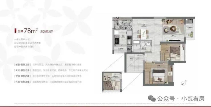 建面76-78平三房一卫,三开间望江,私密入户玄关,带生活阳台,主卧次卧都可望江