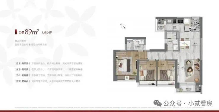 建面87-89平三房两卫,带主套设计,89平四开间朝南,三个房间带有大飘窗