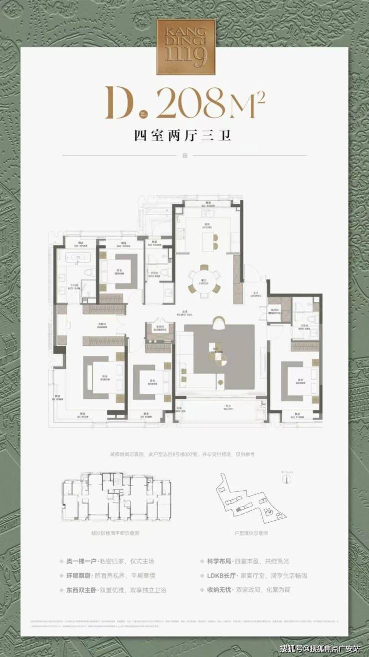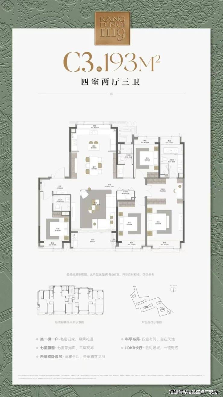 最重要的是,康定壹拾玖这建面约177㎡4房不仅仅是方正,更是飞机户型,三开间朝南+南北通透+无走道的浪费,整个户型相当正气。
