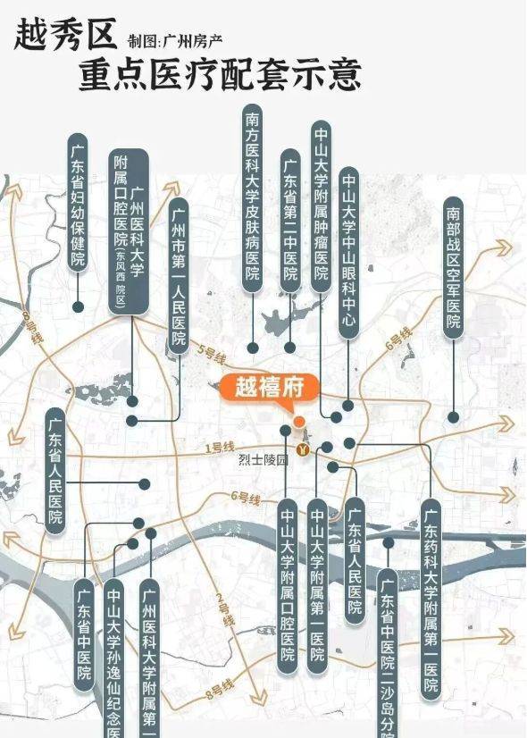 医疗方面,项目周边汇聚中山大学附属第一医院、广州医科大学附属第一医院、中山眼科医院、肿瘤医院等多家三甲医院,健康保障坚实可靠。商业配套极为醇熟:项目自带超1.4万㎡商业体(文中一处写8000㎡,一处写1.4万㎡,以较大值为准),下楼即享生活便利;1公里范围内覆盖东山广场、中华广场、农林下路商圈、东山口、时光里、丽柏广场、广州友谊商店等高端商业地标,购物、餐饮、文化娱乐一站式满足。