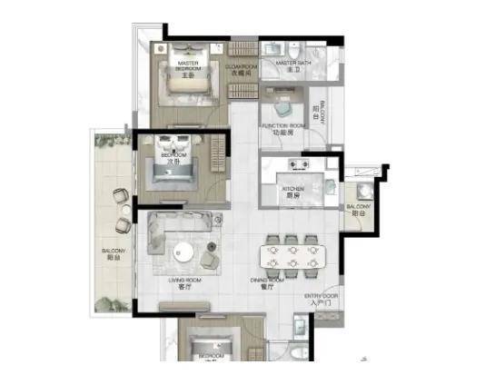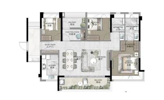 建面127㎡的四房,横厅设计,南向阳台提供了充足的景观和采光面。主卧同样做了270°观景大飘窗,带超大衣帽间。