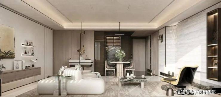 同时,地上地下的双精装大堂的设计,采用鎏金色的门厅设计单元入户门头、采用太古黑石材和绿色奢石等材料点缀的入户大堂内部。