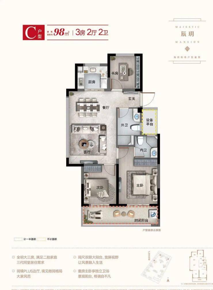 宽景阳台:客餐厅豁达相连,外接双开间宽屏大阳台,阔绰尺度尽从容