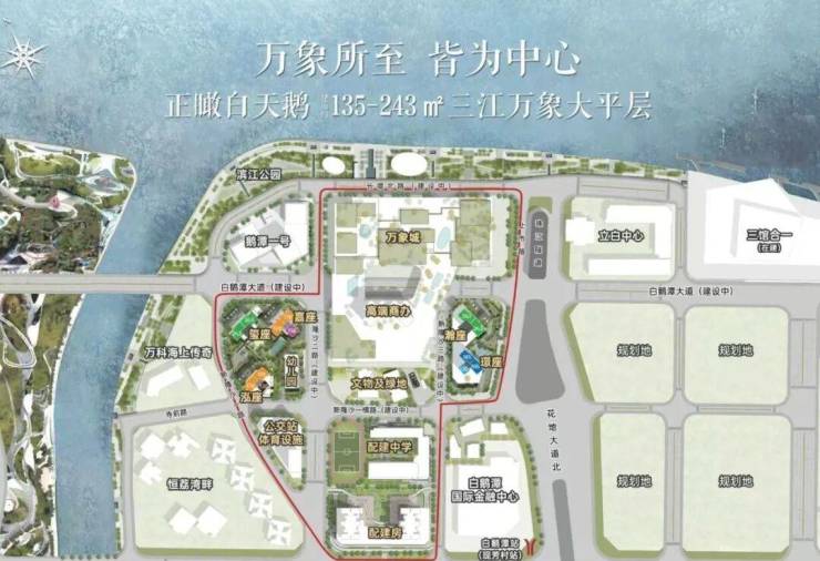 内含约 2.2 万㎡的滨江公园、约 8.3 万㎡的高端商办、约 1.9 万㎡的配建学校,约 26.9 万㎡万象城,及约 17 万㎡三江万象大平层等)