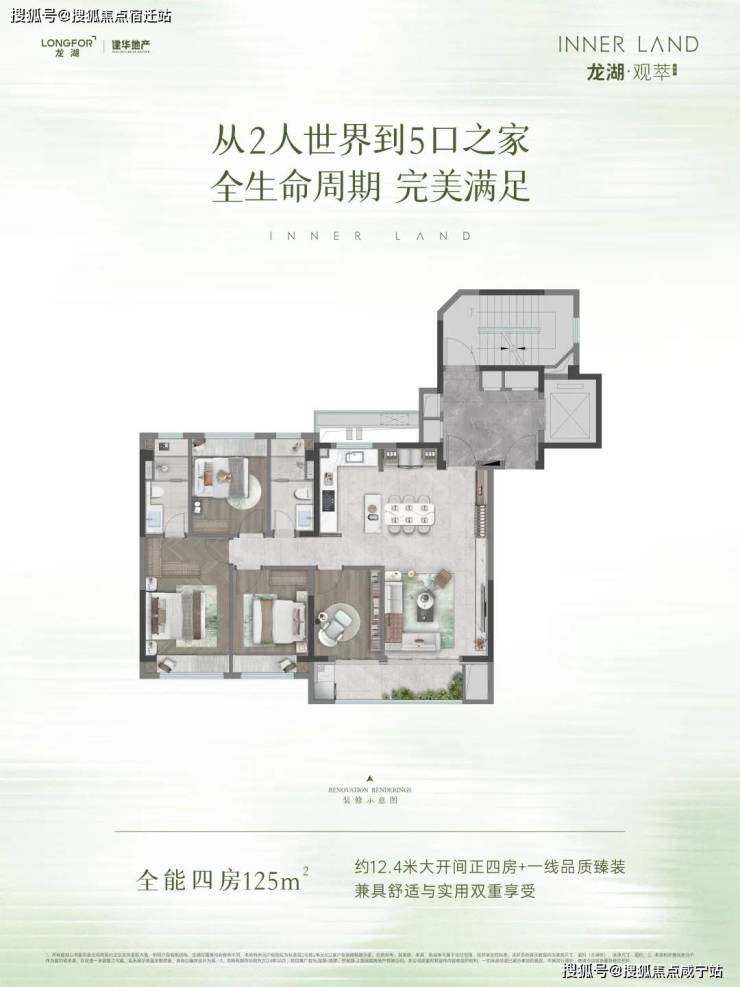 约12.4米大开间正四房,兼顾空间感与功能性,适配全生命周期家庭。
