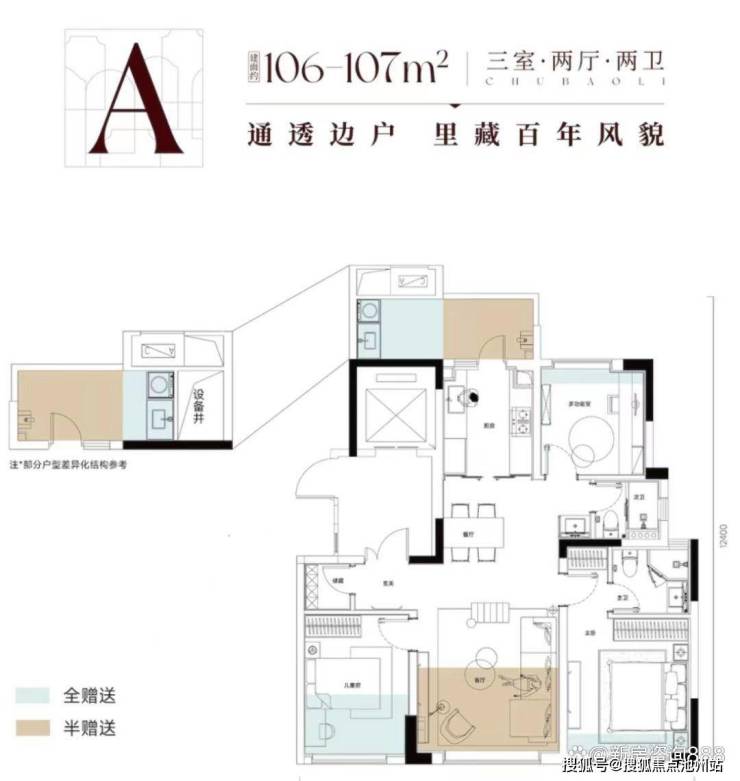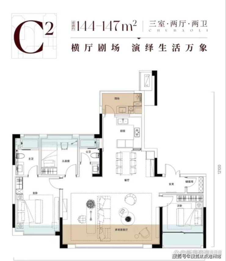 位于12号楼内,也是三开间朝南、带南北双阳台的布局,南向面宽约12.1米,尺寸更优秀,大横厅轻松get;三个卧室均带飘窗,此外,次卫内也有一个飘窗赠送,整体可拓展面积较106平户型更多。