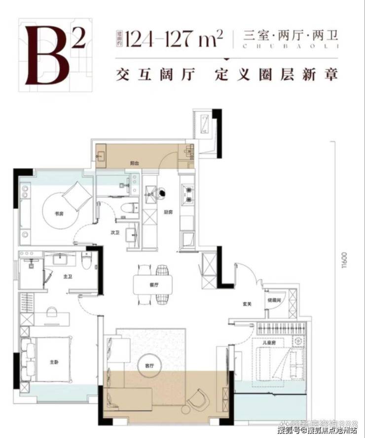 位于11号楼内,属于西瞰小区园林景观的朝向;三开间朝南,西南面开间约10.5米,还比较开阔;南北双阳台,北向阳台外还带一个设备平台,后期可以利用;三个卧室均带全尺寸飘窗,其中儿童房的可拓展面积较另外两个卧室更多。