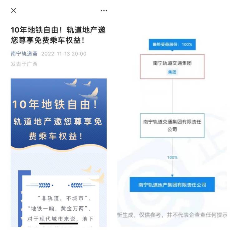 企查查显示,南宁轨道地产是南宁国资委下属的南京轨道交通集团的全资子公司,一家100%的地方国企。