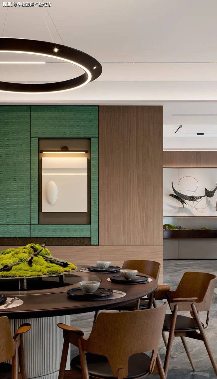 最后是精奢于心的优雅空间,例如由琚宾设计的杭州首个宋韵作品「SONG370」,提取经典名画《西湖全景图》中的丹青意蕴,运用风景开阖、空间对比等传统设计手法,从青玉横幅背景墙到金缕编织墙面
