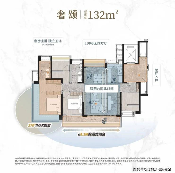 132㎡的户型大四房,拥有LDKG大方厅 约8.3M跑道式景观阳台主卧270°巨幕观景窗,采光私密都非常好。