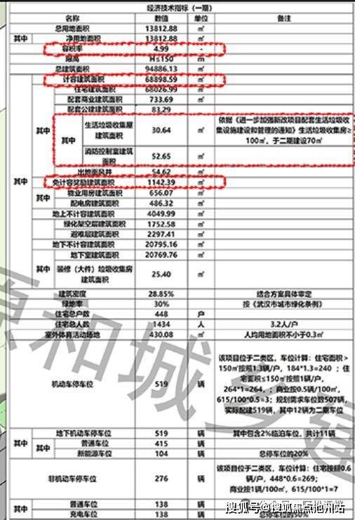 项目一期占地约1.38万方,总建面约9.49万方,计容建面约6.9万方,住宅建面约6.8万方,共约448套房源。规划调整后,项目一期容积率约4.99,项目一期共有约519个地下车位,根据规划需求,一期包含约507个,其中12个车位是二期的,也就意味着一期车位配比约1:1.13。