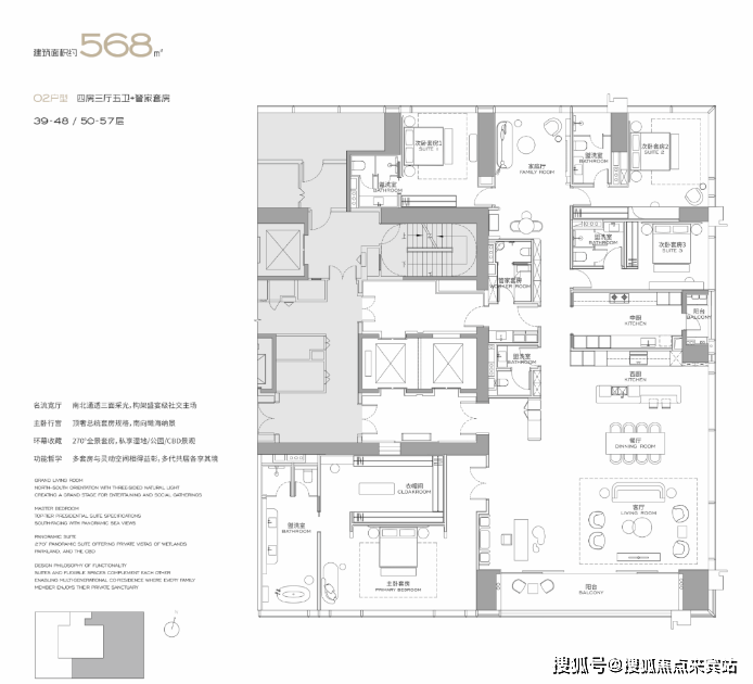 (3-57层)T3栋 四房四卫+家政套间。中西厨分区,餐客西厨一体,带多功能房。端头位置,三面采光。功能完备,房间数充足;实现了主仆双动线;会客观景视野一流。