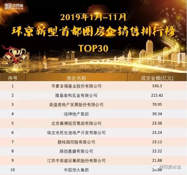 2019年12月20日,克而瑞发布环京新型都市圈排行榜TOP30和环京新型都市圈项目销售排行榜TOP30。数据统计,2019年1-11月,环京新型首都圈前30强房企共实现成交金额989.72亿元,环比增长31.92%。