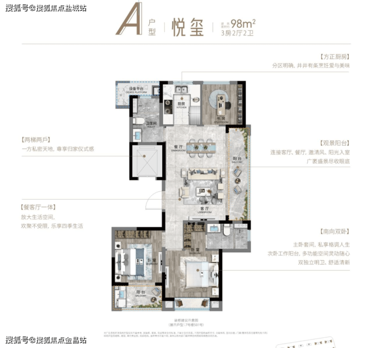 入门,映入眼帘的即是餐客一体的大连厅,阳台一侧巨大的采光面,让整个空间满布阳光,与绿意点缀的设计相映成趣。南向两大开间中,一是自带卫生间、私密度极佳的主卧,一是拥有生活阳台的儿童房,让整个边套既有观景的阔绰感,又有生活的小惊喜。美的龙湖·君兰天玺建筑面积约98㎡户型图