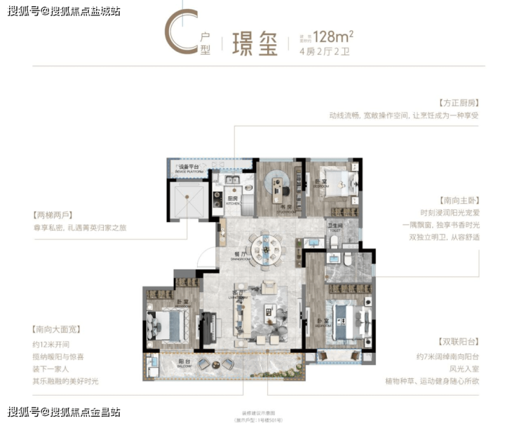 极大的餐厨空间,完全可以设置一个多功能岛台,母亲配菜也方便照看小孩;北部两房更是可直接拓展成第二大卧室,或是将健身、书房、茶室、影音室等众多场景置于其中,十分灵活多变。美的龙湖·君兰天玺建筑面积约128㎡户型图
