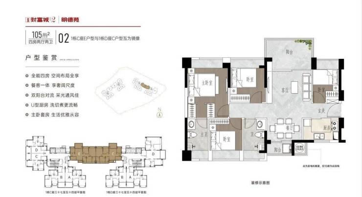 105㎡4房2厅2卫:竖厅南北通透格局,客厅3.5米开间,全屋飘窗双阳台设计,4个卧室宽度分别为3.25/2.85/2.6/2.1米,U型厨房,得房率约76%(不含赠送),阳台主朝西南向,折后总价约348-372万,满足多孩家庭的居住需求,空间利用率高。