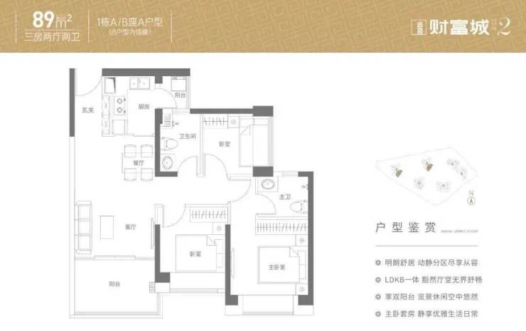 89㎡3房2厅2卫:经典竖厅格局,客厅3.29米开间,3个卧室宽度分别为3.3/2.8/2.5米,L型厨房带生活阳台,得房率约76%(不含赠送),西南、东南及东北朝向,折后总价273万起,兼顾实用性与舒适性,适合三口之家刚需改善。