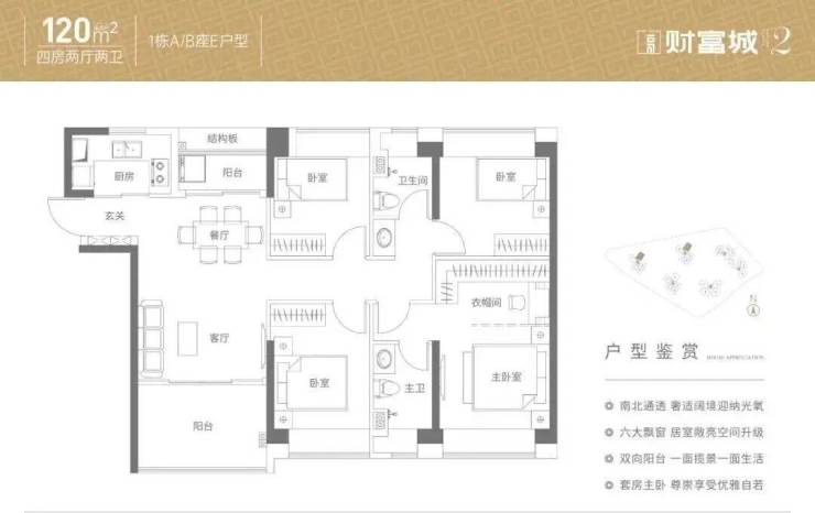 120㎡4房2厅2卫:竖厅南北通透格局,双阳台设计,客厅3.6米开间,4个卧室宽度均在2.75米以上,U型厨房,得房率约76%(不含赠送),阳台主朝东南、西北、东北向,折后总价约393-420万,空间开阔,适合改善型家庭,居住舒适度高。