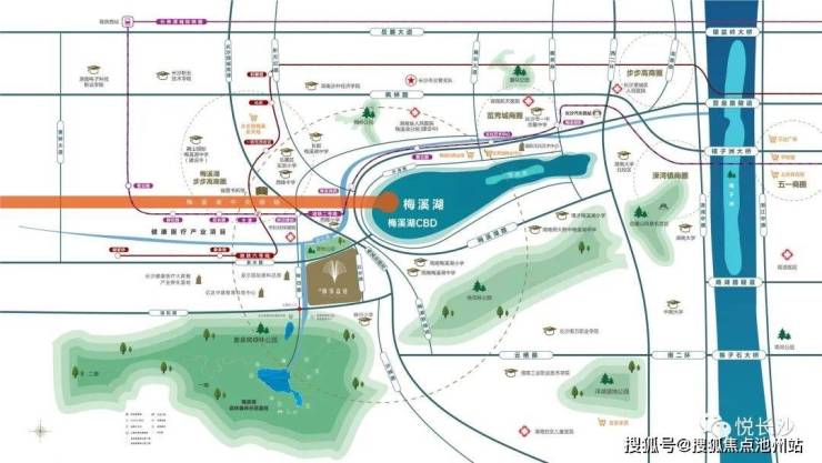由项目门前必经的泉水路从东往西看,几乎连接了梅溪湖2.0时代康养健康布局的每一个重量级名字。
