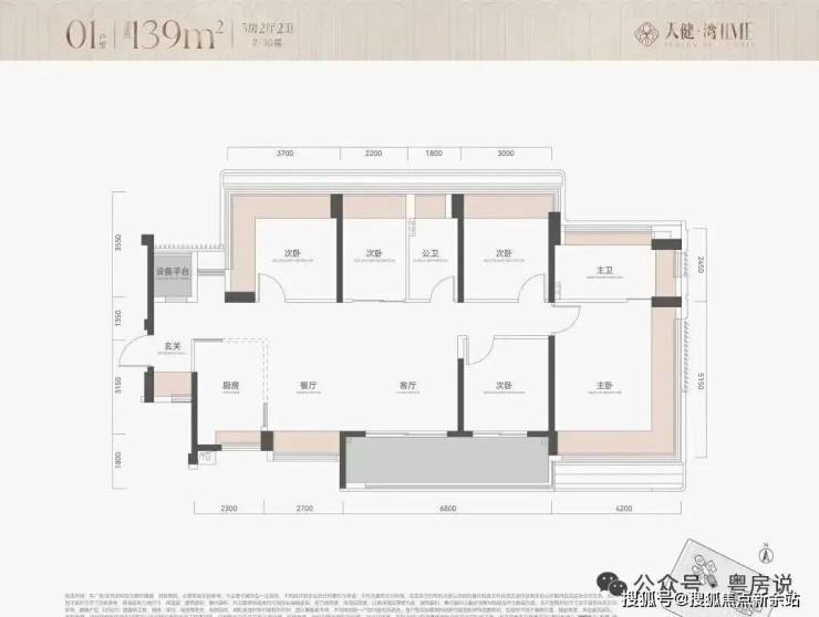 139㎡5房2卫,竖厅户型,朝南看海,户型结构和115接近,多了一间朝南卧室,主卫做了双面凸窗;
