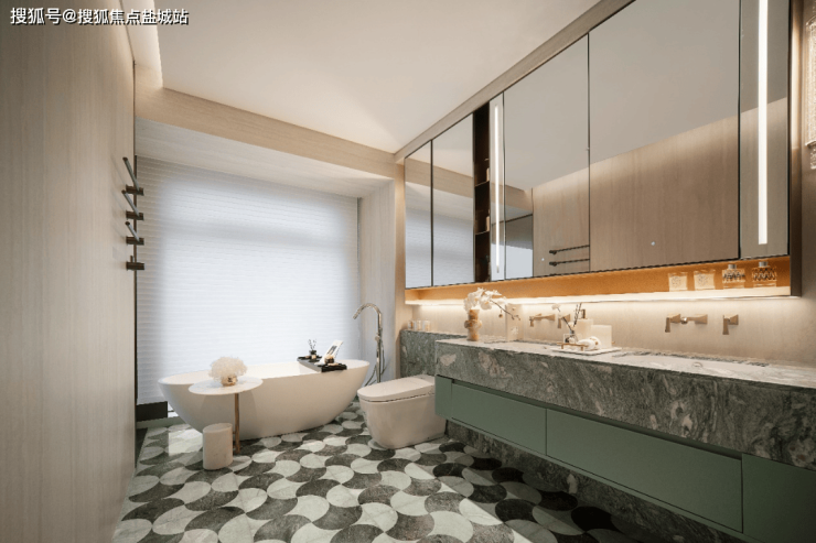 主卧的锤纹门把手、地板花瓣拼、镂花的空调出风口每一个都是世界级的工艺。同样,精装的用材也很考究,从电梯厅到室内各种奢材在这里齐聚,瑞士翡翠、白雪公主、蒂芙尼绿、巴黎金等奢石,还有仿锤纹夹丝玻璃、仿古锈镜、隐木这些罕见用材增添艺术质感。