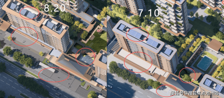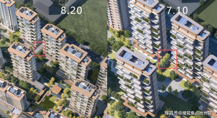 6、外立面调整:非四代宅以6#、7#为例,边侧减少实体墙增加了玻璃幕墙面积,采光更加通透,四代宅4#、5#、8#为例,边侧同样减少实体墙,增加玻璃幕墙,采光更为优秀,南侧专属绿化平台增加了弧形。