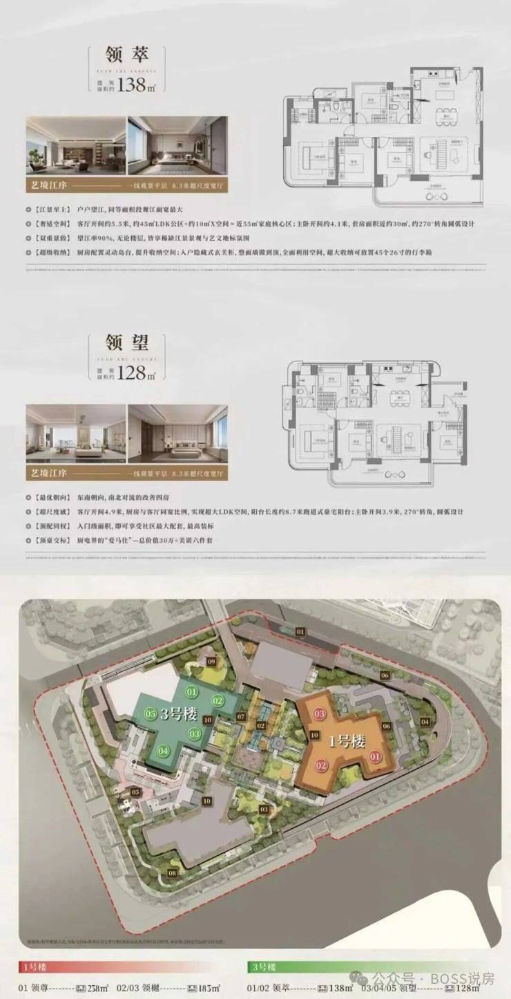 据了解,「尚滨道」预计首推1、3栋,3栋主打128-138㎡,1栋主打168-238㎡大平层,使用率超100%,3T户。