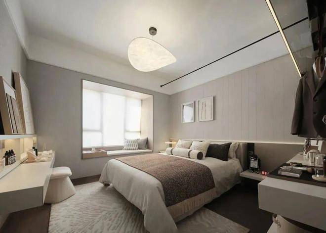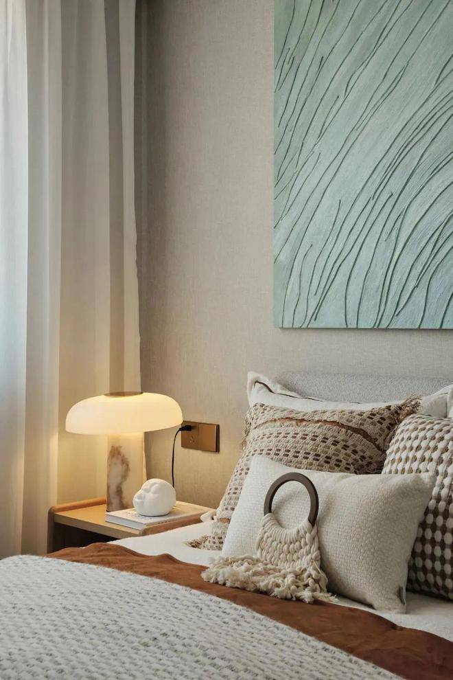 当你从客厅缓缓走向卧室时,光线巧妙地逐渐从明亮转为微暗,如同自然界的日落一般,这样的设计让人的心情也随之变得宁静而平和。柔和的灯光洒在卧室的每一个角落,形成点点晕散的感觉,宛如星空般梦幻。