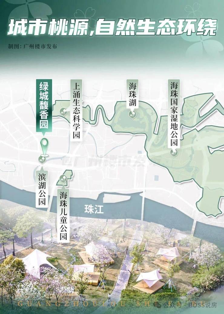 南侧邻近海珠儿童公园、滨河绿地 / 规划滨河公园;约 1.3 公里可达珠江后航道,高层可眺望江景;