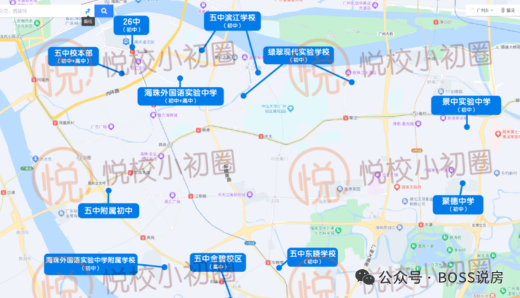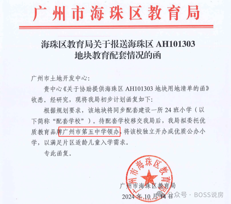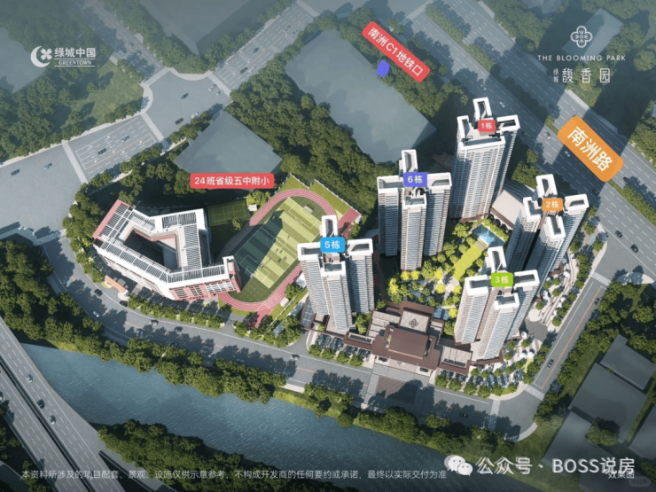 自带24 班公立小学(广州五中附属实验学校),由广州五中教育集团领办(省一级、国家级示范性高中背景),预计 2026 年开学;