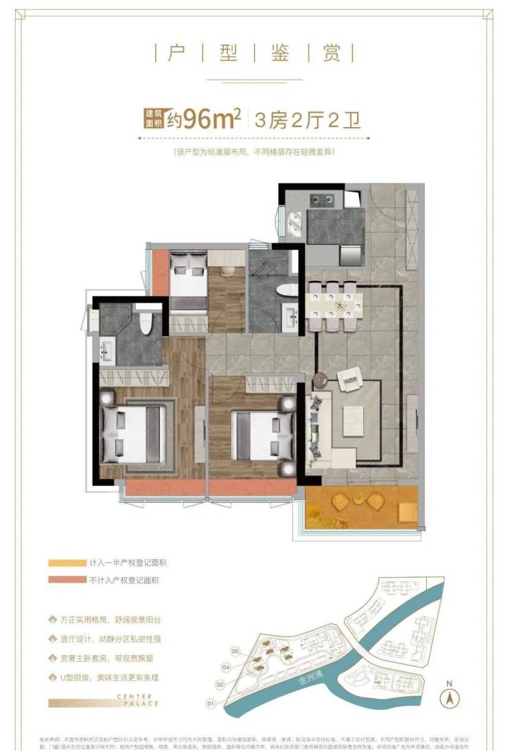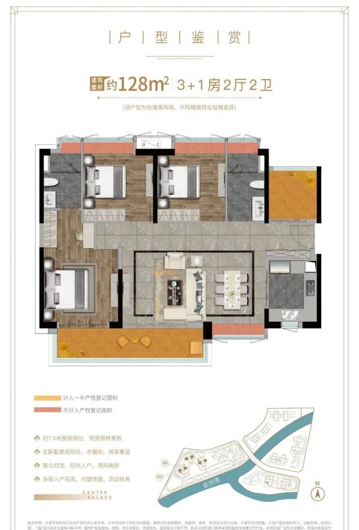 整个项目总占地约8.3万㎡,总建筑面积约35万㎡,内部分为A、B、C、D共4个区域,每一区之间有金洲涌分隔。由于是旧改项目,所以C、D区用作回迁安置,共有8栋,以两梯六户跟两梯四户为主。A、B区8栋为商品房。