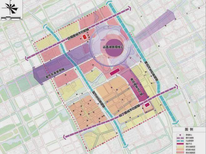 远香湖CAZ 空间格局规划为“一心、两轴”,其中最重要的“一心”,即远香湖核心,在远香湖沿岸布置高等级公共文化活动设施,形成生态文化复合型的大型滨湖城市会客厅。