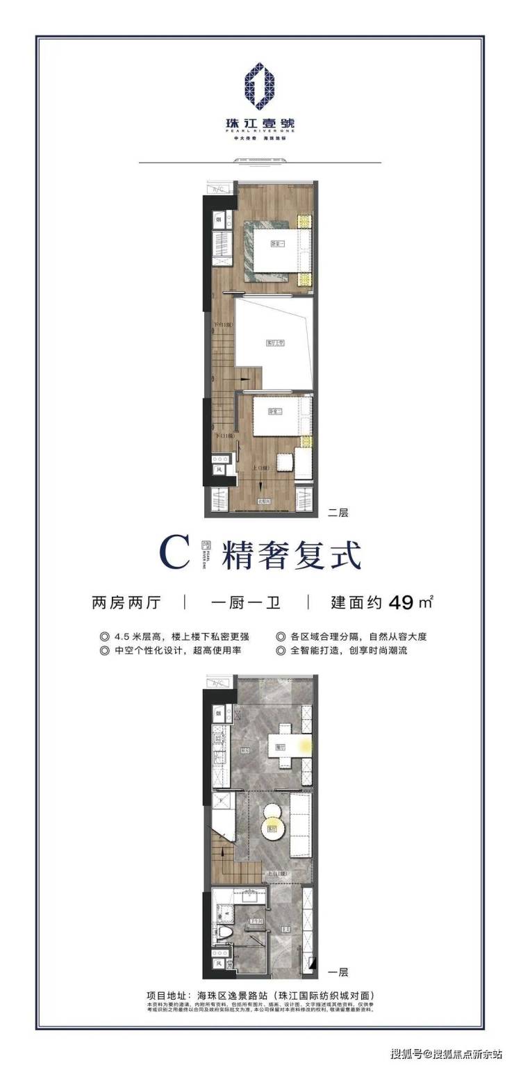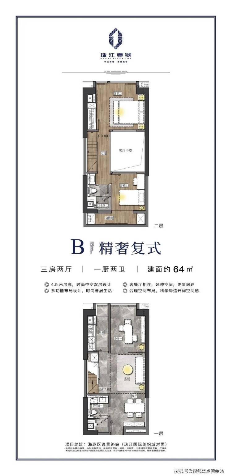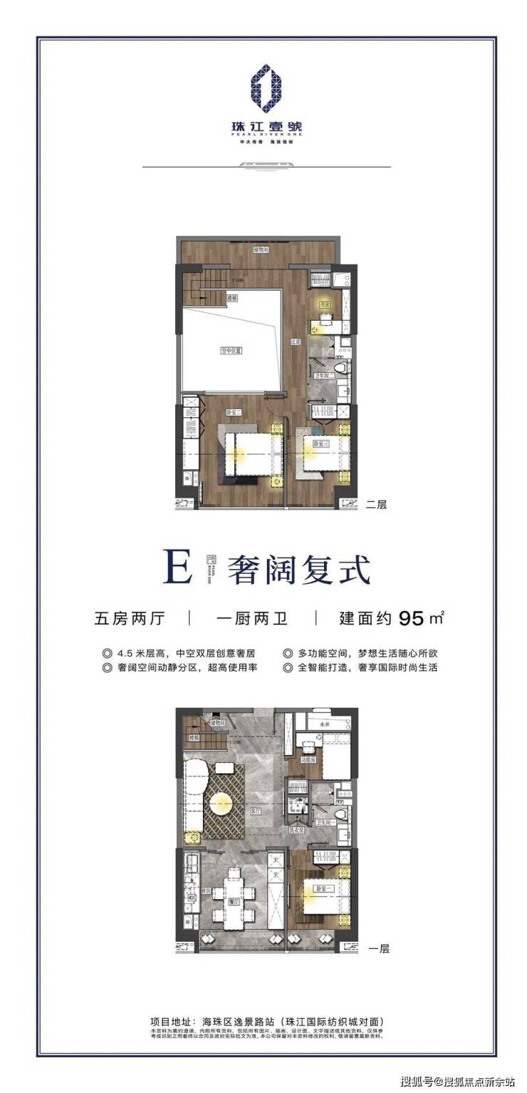 4.5米中空挑高设计,视野开阔不压抑;开放式厨房、超宽飘窗、两房左右分开布局、动静分区、每一个细节都力求给住户最舒适的入住感受。