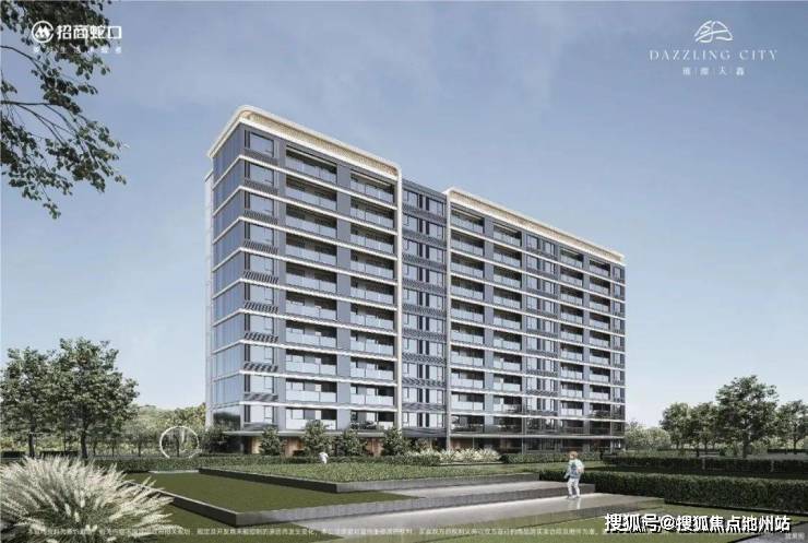 璀璨天鑫外立面延续招商经典IP视觉——非对称宽幕立面设计,香槟金金属板+浅灰色质感立面,特色的风帆塔冠造型,立体层次感更强,精致而不繁琐。