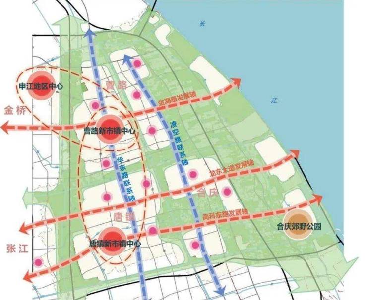所以在曹路2035规划中,曹路板块的未来发展是可以借力的。一是借力金桥,联动金桥副中心;二是借力唐镇,打造唐镇-曹路-合庆城镇圈。唐镇-曹路-合庆城镇圈中,除了唐镇,另外两个重要节点都在曹路内,这两个重要节点-曹路新市镇中心、申江地区中心-势必会成为曹路未来发展的重点。