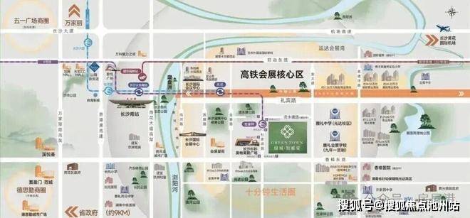 项目所处的地理位置非常好,占位长沙国际会展新城核心区域,出小区即地铁4号线杜家坪站,只需要坐1站便可换乘地铁2号线,东侧一路之隔是在建的九年一贯制雅礼会展学校(暂定名)和雅礼中学东校区(本部一校两址,今年9月正式开学),西侧一路之隔是超15万方奥特莱斯购物广场(230多家国际一线品牌店,超过一半是城市首店或旗舰店,预计今年9月26日正式开业)。