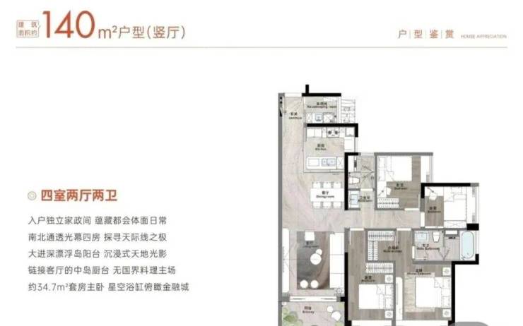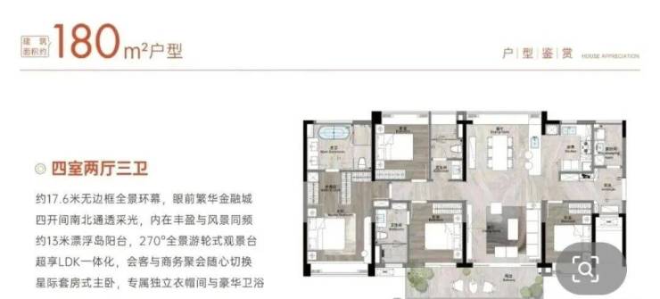 建面180平四房,会客厅面积超40平,南北采光面约17米,更有7.4米的宽景阳台,做到了南向4.5开间朝南,更是双主套设计。