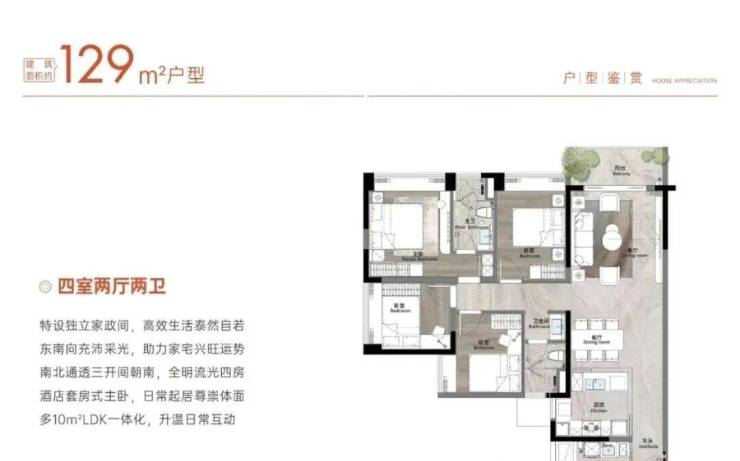 建面129平四房,LDK一体化设计,传统的竖厅户型,餐厅采光一般。亮点是入户花园做了家政房,洗衣机、储物那些就放门口。