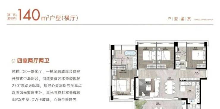 建面140平四房,LDK设计,同样自带入户花园三面采光,采光面高达18米,另外加上直通南向阳台,采光和通风都非常不错。