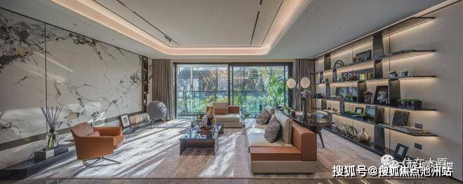 客厅及主卧南向整面墙壁都是落地推拉门,门外则是贯穿客厅和主卧的通体室外空间,长度更是达到了约10.8米,将自然与室内生活巧妙融合,坐观和园美景。