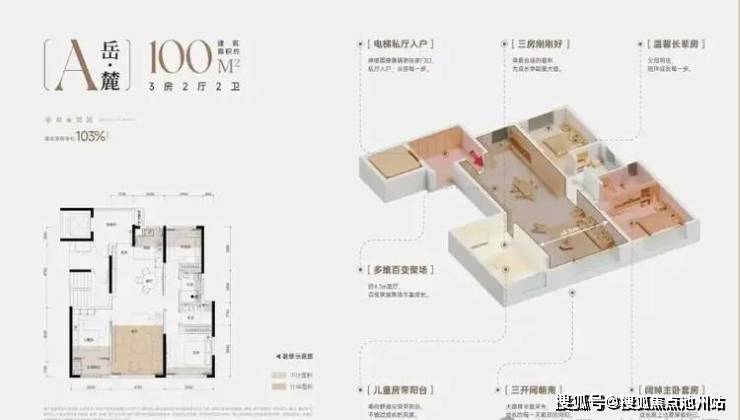 100㎡“岳麓”户型:三房两厅两卫,得房率高达103.3%,实得面积堪比老规117㎡;三开间朝南(总开间约10.8米),3米层高,南北通透,无论是二人世界还是三口之家,都能住得舒适;