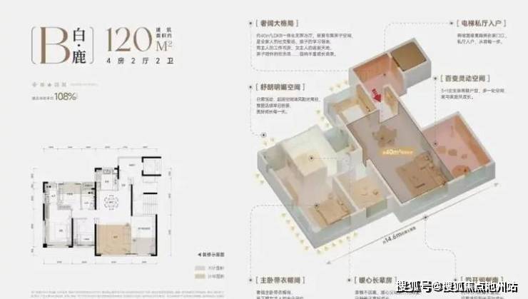 120㎡“白鹿”户型:四房两厅两卫,得房率108.7%,实得面积约130㎡(堪比老规148㎡);4.7米开间客餐厅实现LDKB一体化,四开间朝南(采光面达14.6米),主卧+主卫双面采光,从容应对四口之家或三代同堂。
