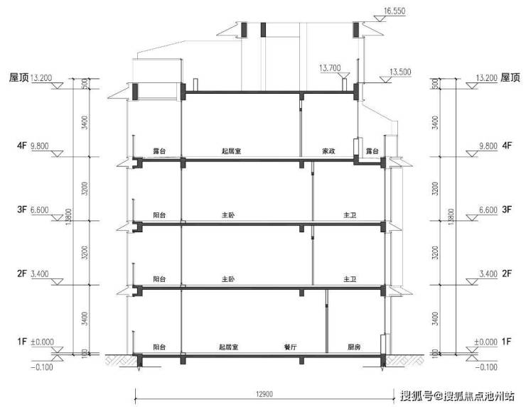 我以前一直不建议买叠拼,原因就是开间太小,但现在的叠拼基本解决了这个问题。这次姚江润园的叠拼,开间来到了约11.5米,客厅开间约7.7米。包括他的层高,也比以往的叠拼要高,下叠首层层高约3.4米,二层约3.2米。上叠因为做了倒置处理,所以是二层约3.4米,一层约3.2米(下图)。这个自己理解一下,是现在很流行的做法,避免了业主去顶楼露台还需要经过卧室区的问题。所以说,现代叠拼的空间尺度感是拉满的,完全配得上“墅”的说法。